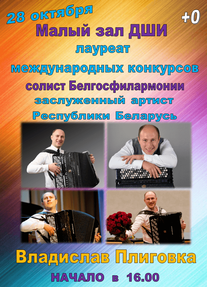 Приглашаем на концерт заслуженного артиста Республики Беларусь, солиста Белорусской государственной филармонии. Владислав Плиговка является стипендиатом, лауреатом и обладателем Гранд-премии специального фонда Президента Республики Беларусь по поддержке талантливой молодежи. Он первый и единственный представитель Республики Беларусь, завоевавший титул абсолютного чемпиона мира за всю историю конкурса, проводимого Международной конфедерацией аккордеонистов с 1938 года. Обладатель первых премий на Тихоокеанском Чемпионате аккордеонистов (г.Сидней, Австралия), Международном конкурсе аккордеонистов «Фогтландские дни музыки» (Германия), Международном конкурсе аккордеонистов “Grand-Prix” (Франция), Международном конкурсе “Citta di Castelfidardo PIF” (Италия). Победитель Высшей лиги мэтров мирового баяна и аккордеона на II Международном конкурсе-фестивале профессионального исполнительского искусства “ACCOHOLIDAY” (Украина).