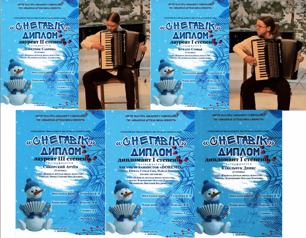 Поздравляем учащихся  школы: Букато Софью, Демидчик Сабрину учитель Пальчинская О.А., Сикорского Артёма учитель Чичко Г.М., Кавальчука Дениса, ансамбль «DOREMIX» руководители Мельникова В.В., Ключенович Н.П. с победой в Открытом фестивале–конкурсе инструментальной музыки «Снегавік-2026» г.Любань