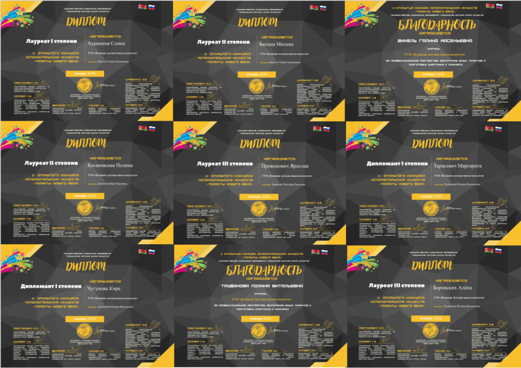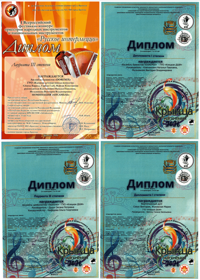 Поздравляем учащихся школы: Жуковскую Марию, Сокол Викторию учитель Винель Г.Х., ансамбль баянистов «Doremix» рук.Ключенович Н.П., Мельникова В.В., ансамбль цимбалистов «Званочкі» рук. Дудук О.П., концертмейстер Нефёдова О.Г. с победой в VIII Открытом конкурсе ансамблевого и оркестрового исполнительства «Крыніца натхнення — 2026» г.Минск, ансамбль баянистов «Doremix» с победой в I всероссийском фестивале-конкурсе ансамблей и оркестров народных и национальных инструментов «РУССКОЕ ИНТЕРМЕЦЦО» г.Братск.