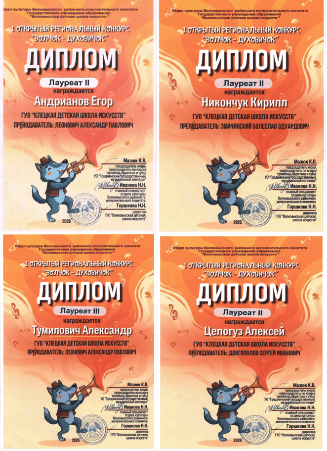 Поздравляем учащихся школы: Андрианова Егора, Тумиловича Александра учитель Леонович А.П., Целогуза Алексея учитель Довгополов С.И., Никончука Кирилла учитель Змачинский Б.Э. и концертмейстеров Нефёдову О.Г., Захарову Т.С. с победой в Открытом региональном конкурсе на духовых и ударных инструментах «Волчок-духовичок» г.Волковыск