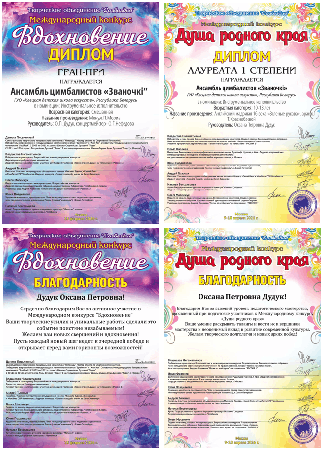 Поздравляем учащихся школы: ансамбль цимбалистов «Званочкі» руководитель Дудук О.П., концертмейстер Нефёдова О.Г. с победой в Международных многожанровых конкурсах «Вдохновение», «Душа родного края» г.Москва.