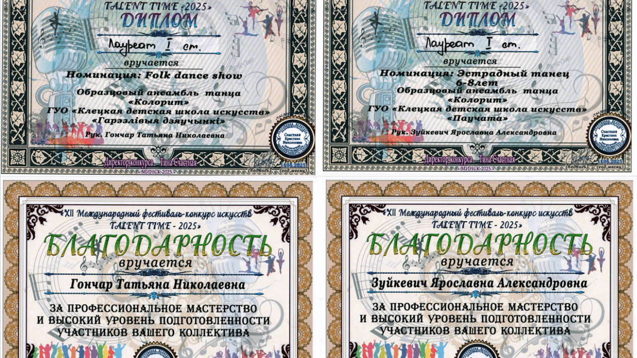 Поздравляем участников образцового ансамбля танца «Колорит» рук. Гончар Т.Н., Зуйкевич Я.А. с победой в VIII Международном фестивале-конкурсе искусств «TALENT TIME-2025» г.Минск