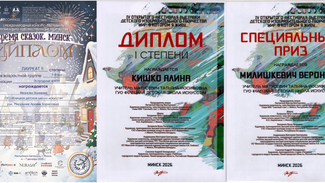 Поздравляем Кишко Алину, Милишкевич Веронику учитель Матусевич Т.И. с победой в IV Международном открытом фестивале-выставке изобразительного творчества «Мир, в котором я живу.. » г.Логойск, Иванову Валерию учитель Мирошник А.Б. с победой в I Международном конкурсе-фестивале музыкально-художественного творчества «Время сказок» г.Минск