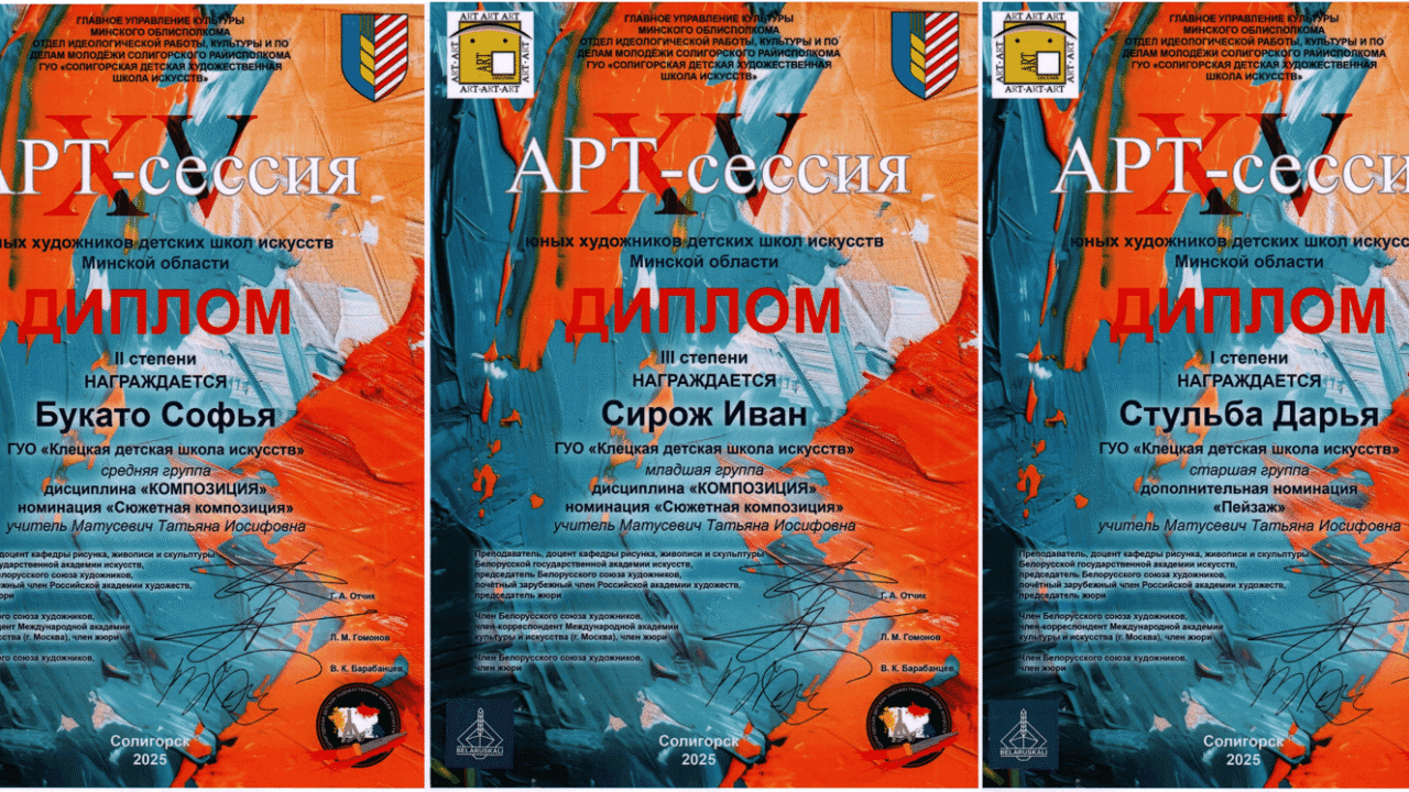 Поздравляем Букато Софью, Сирож Ивана, Стульба Дарью учитель Матусевич Т.И. с победой в областной «Арт-сессии юных художников детских школ искусств» г.Солигорск