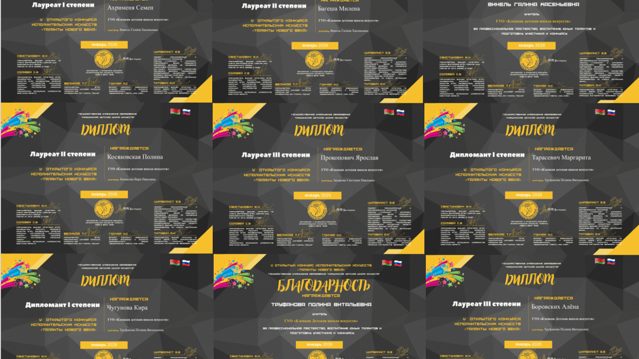Поздравляем учащихся школы: Прокоповича Ярослава учитель Захарова С.П., Ахрименя Семёна, Багеша Милену учитель Винель Г.Х., Косяковскую Полину учитель Новикова В.П., Чугунову Киру, Боровских Алёну, Тарасевич Маргариту учитель Труфанова П.В. с победой в V открытом конкурсе исполнительских искусств «Таланты нового века» аг.Крошин.