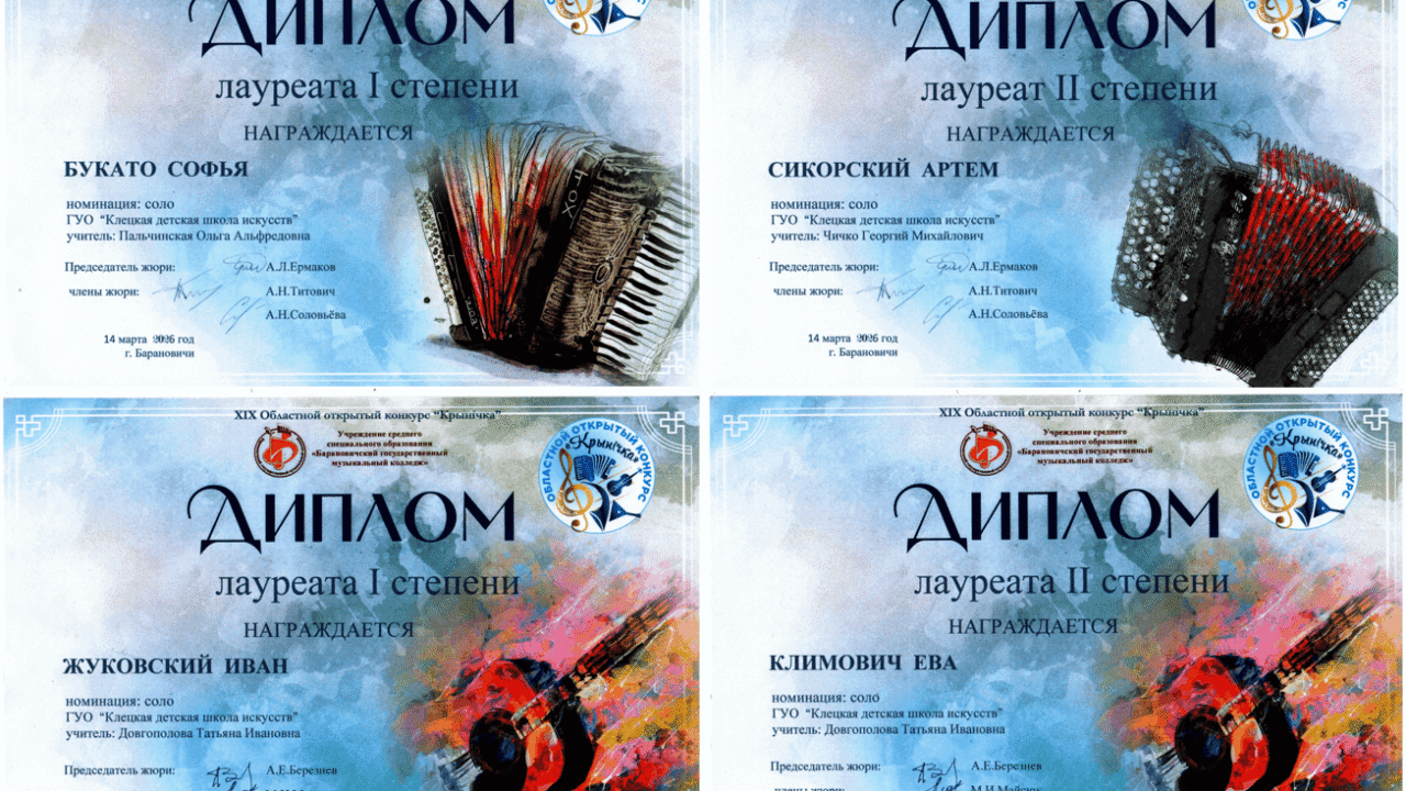 Поздравляем учащихся школы: Букато Софью учитель Пальчинская О.А., Сикорского Артёма учитель Чичко Г.М., Климович Еву, Жуковского Ивана учитель Довгополова Т.И. с победой в XIX областном открытом конкурсе «Крынічка» г.Барановичи